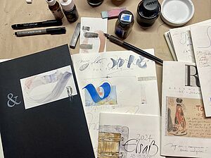 | Hinweis: | Material Bringt bitte euer vorhandenes Kalligrafiewerkzeug mit, wir brauchen keine besonderen und umfangreichen Materialien, sondern spielen mit Gestaltungsideen und Farben. Dabei sein sollte: Bleistifte, Fineliner, Farbstifte, Flachpinsel, Wasserglas, alter Lappen oder Zewa Schreibgeräte und Flüssigkeiten, die ihr habt oder gerne nehmt. Skizzenbuch: gut geeignet zum Probieren ist ein DIN A4-Heft (z. B. Boesner Serie ARS NOVA) oder das Gerstäcker Spiral-Skizzenbuch im Format 25 x 25 (wenn ihr mehr Platz für Ideen braucht). Ich verwende auch das LANA Skizzenpapier, schneide es mir passend zu und nähe es zusammen. Wichtig ist, dass es ein Papier ist, auf dem die Flüssigkeit nicht ausblutet. Übungspapier und Kopien sind wie immer im Kurspreis inbegriffen, ebenso die Möglichkeit, Basisschreibmaterial kostenlos zu verwenden. Kalligrafiematerialien können auch bei der Kursleiterin erworben werden. Ich werde auch ein paar Skizzenhefte mitbringen. |
